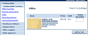 Your Catalog Orders page has a menu on the left side that lists the different catalog sections available. You may use this menu to find the items you are looking for, or you may use the Search feature available at the top of every page. Enter the quantity you want to order for each item in the list, and click the Add to Cart button. You will then be shown the Shopping Cart page, where you can adjust quantities, or continue shopping.