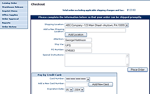 Your Checkout page shows your order total, and asks for shipping and payment information. You may choose a shipping location from the drop-down box, or add a new location by entering the address in the Add a New Shipping Location promt and clicking Add Location. For the fastest service, please enter the information requested in the Attention, Ship Via and PO Number prompts. You may also enter any additional instructions. Our site is secure, and you can feel safe entering your credit card information.