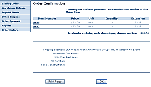 Your Order Confirmation page shows your order number, total, items ordered, and shipping information. You may print this information for you records by clicking the Print Page buton. Click the OK button when you are finished viewing the confirmation information. You will then return to your main online ordering page.