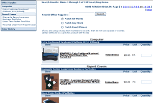Your Office Supplies page has a menu on the left side that lists the different catalog sections available. This list defaults to the results of the last search you performed for office supplies. More Search result pages are listed to the right of the menu box. You may