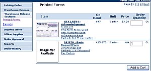 Your Warehouse page has a menu on the left side that lists the different warehouse sections available. You may use this menu to find the items you are looking for, or you may use the Search feature available at the top of every page. Enter the quantity you want to order for each item in the list, and click the Add to Cart button. You will then be shown the Shopping Cart page, where you can adjust quantities, or continue shopping.